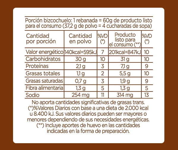 Polvo listo para preparar bizcochuelo sabor a chocolate. Permite obtener bizcochuelos de muy buen volumen, estructura homogénea y levemente aireada. Con cambios en la receta y procesos sirve para elaborar bizcochuelos saborizados, bases para semifríos, pio-nonos, tapas de alfajores, plantillas.