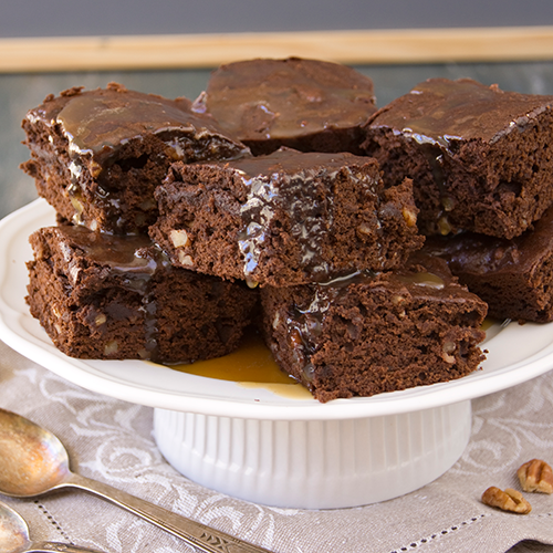 450 gr Premezcla Brownie Fleischmann en Casa 2 huevos 60gr de manteca derretida 15 cc de agua 100 gr nueces 100 gr dulce de leche