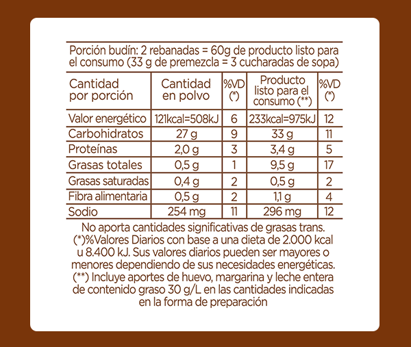 Polvo para preparar budín. Desarrollada especialmente para elaborar budines esponjosos y de excelente calidad, batiendo toda la mezcla de una sola vez. Formulada para budín inglés, también permite la elaboración de torta arena, budines de naranja, limón, marmolado o del sabor de su elección.