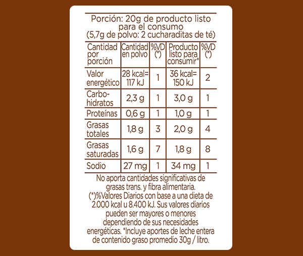 Crema vegetal para preparar Chantilly sabor a chocolate. Es fácil y rápida de preparar, sólo se debe batir con globo en batidora. Tiene gran estabilidad, duración y rendimiento. Es un producto instantáneo en polvo, elaborado con materias primas de la más alta calidad. Al prepararla con leche fría forma una crema lista para rellenar y decorar tortas, pasteles y postres.