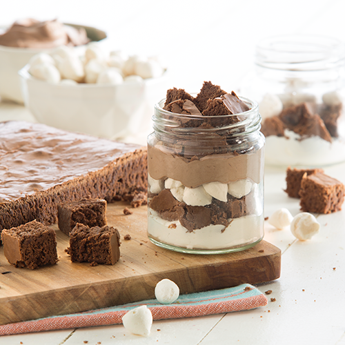Colocar en copas o vasos transparentes capas de Chantilly Fleischmann tradicional, Chantilly Chocolate, merenguitos picados y el licor de tu elección con trocitos de brownie intercalados.